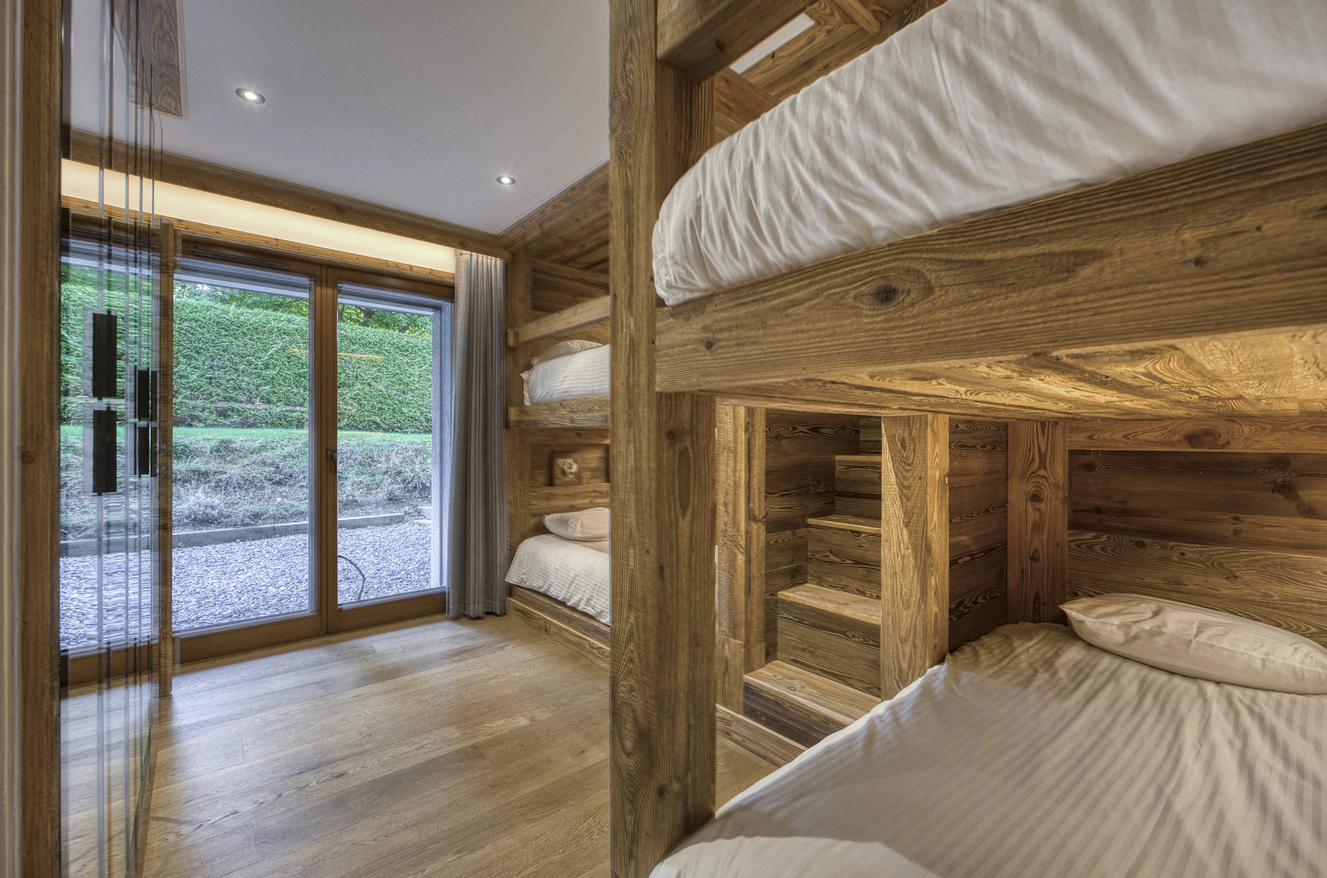 Une chambre dortoir avec double lits superposés, placards/penderie, salle de bains avec toilettes et accès jardin,
