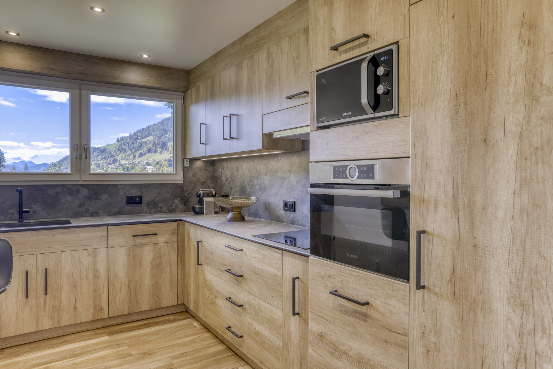 - une cuisine séparée avec ouverture sur le salon (4 feux induction, four, micro-ondes, réfrigérateur, lave-vaisselle, cafetière Nespresso,...)